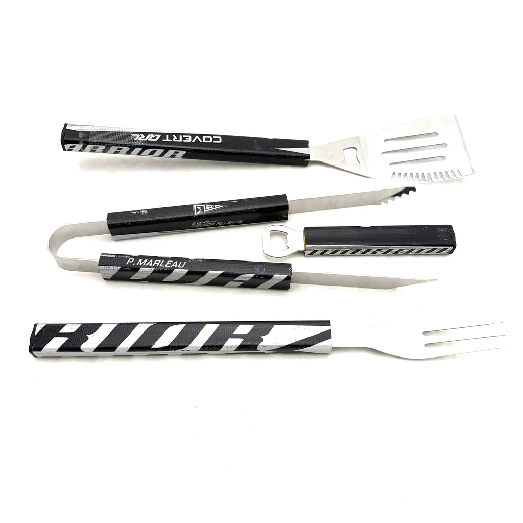 - Set includes; tongs, spatula, fork, bottle opener
